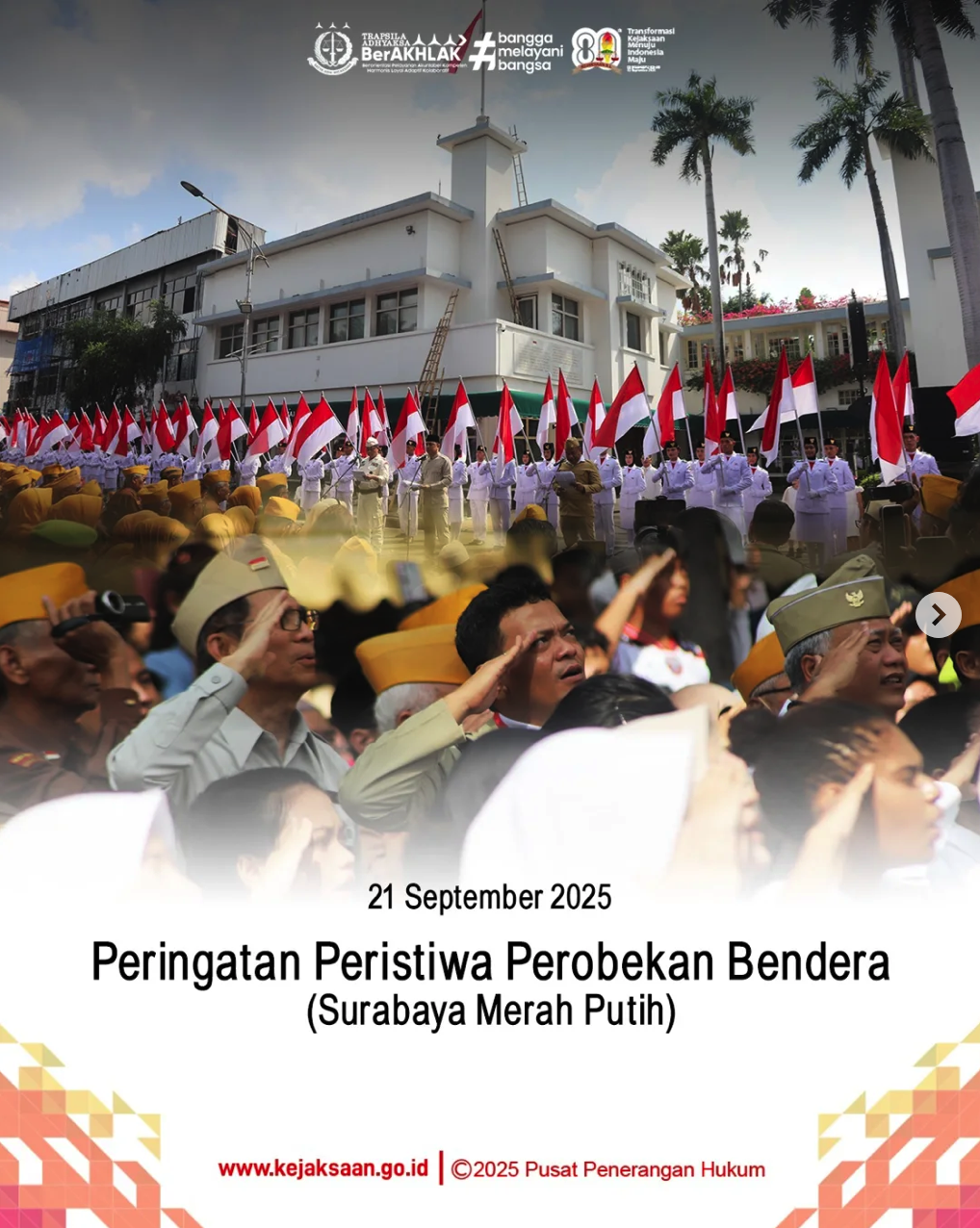 Minggu, 21 September 2025 Di Depan Hotel Majapahit dilaksanakan peringatan Peristiwa perobekan warna biru pada bendera Belanda yang berkibar di Hotel Yamato yang kini menjadi Hotel Majapahit, terjadi pada 19 September 1945. Peristiwa ini didahului oleh gagalnya perundingan antara Indonesia dengan W. V. C. Ploegman untuk menurunkan bendera Belanda yang dikibarkan di hotel tersebut. Walikota Surabaya Dr. Eri Cahyadi S.T., M.T beserta Forkopimda menyaksikan teatrikal arek-arek Suroboyo yang berjuang mempertahankan kemerdekaan Republik Indonesia. Hadir pula Tri Satrio Wahyu Murthi, S.H., M.H Kepala Seksi Pemulihan Aset dan Pengelolaan Barang Bukti PAPBB Kejaksaan Negeri Surabaya, Beliau memberikan hormat pada bendera merah putih yang telah berhasil di robek warna birunya oleh arek-arek Suroboyo.